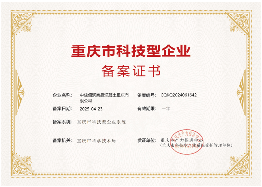 近日,中建西部建设(002302)一公司重庆区域佰润厂(工商注册:中建佰润商品混凝土重庆有限公司)、璧山厂(工商注册:重庆飞强新材料科技有限公司)技术创新实力与发展潜力获当地政府高度认可,成功备案重庆市科技型企业,并获认定证书。
